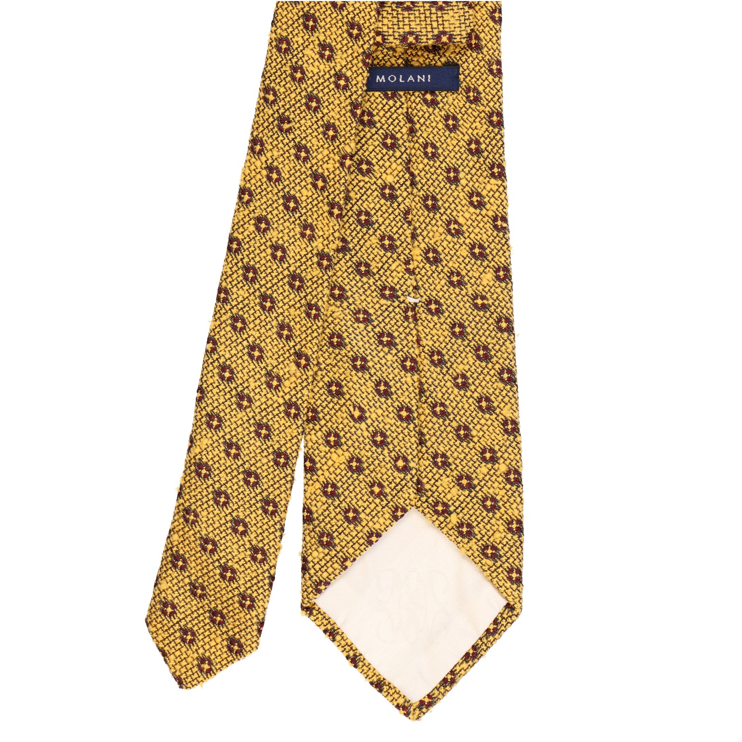 Gefertigt aus edler Shantungsseide, besticht diese Krawatte durch ihre charakteristische, leicht unregelmäßige Struktur, die ihr eine lebendige, fast handgewebte Anmutung verleiht. Das feine Muster aus bordeauxfarbenen Sternblüten auf warmem Safrangelb erinnert an mediterrane Spätsommertage und kunstvolle Keramiken aus Italien.