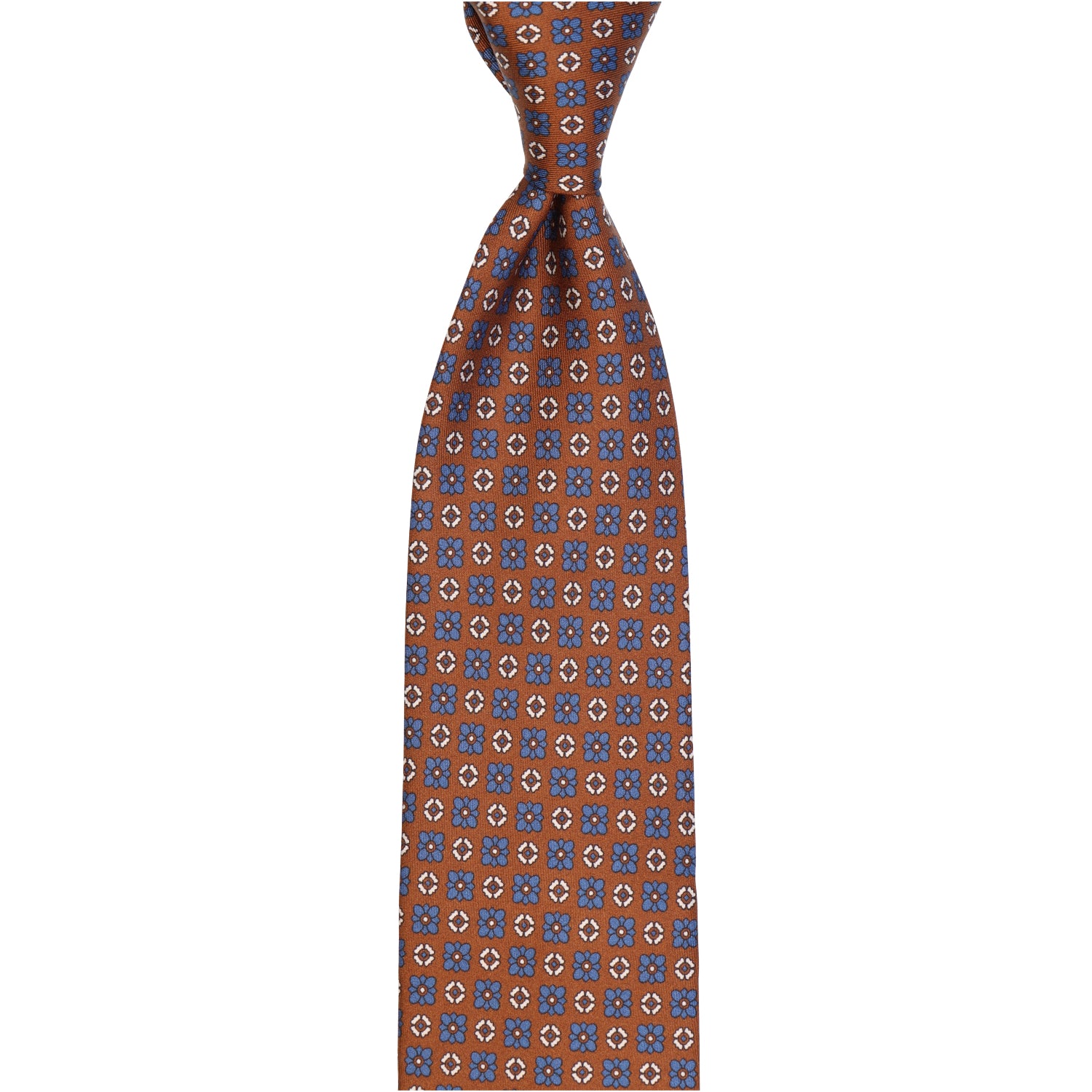 Ein florales Mosaik, das klassische Eleganz mit einem Hauch italienischer Lässigkeit verbindet: Das feine Muster dieser Krawatte spielt mit stilisierten Blüten, die rhythmisch auf einem warmen cognacfarbenen Fond tanzen – akzentuiert durch sanftes Kornblumenblau und cremefarbene Details.