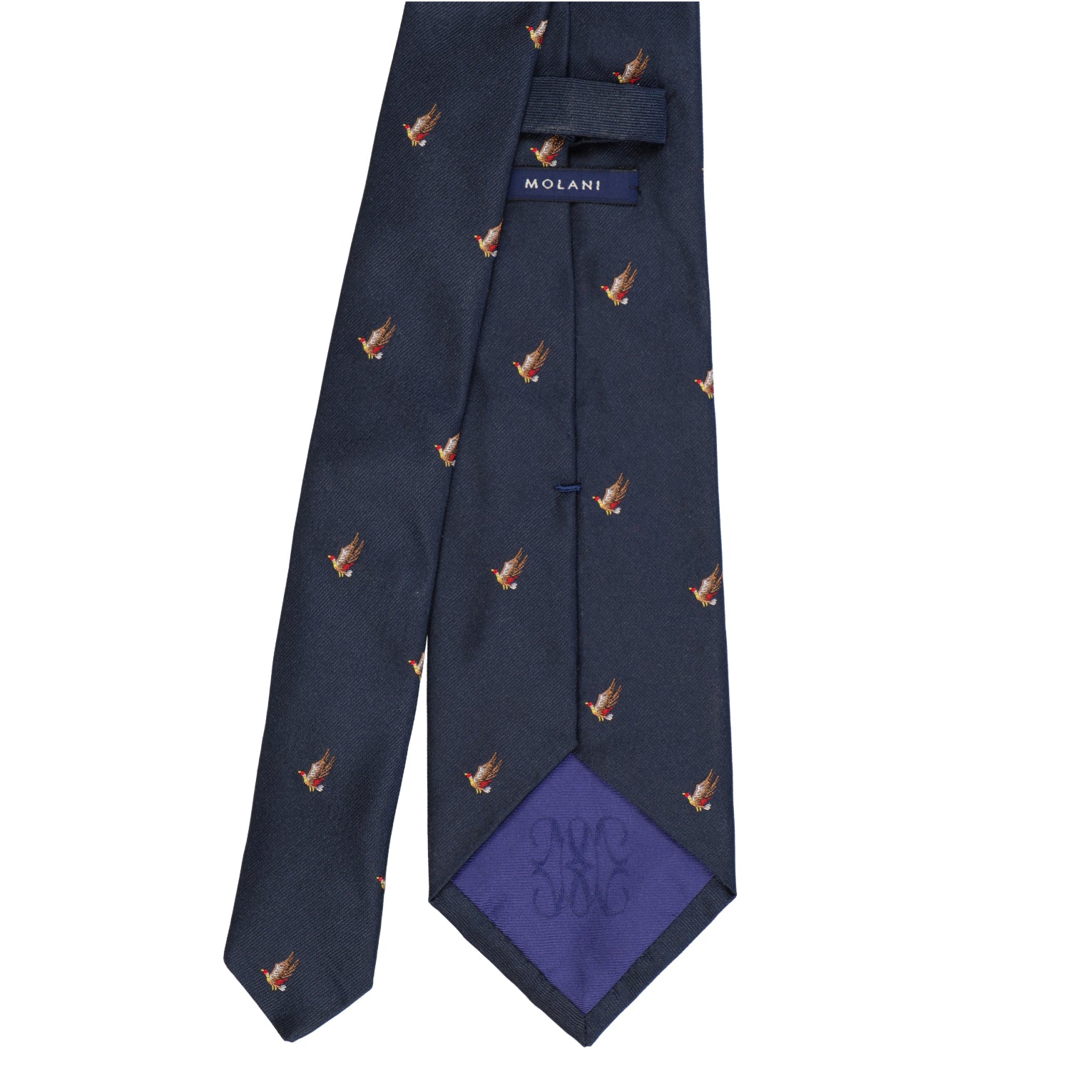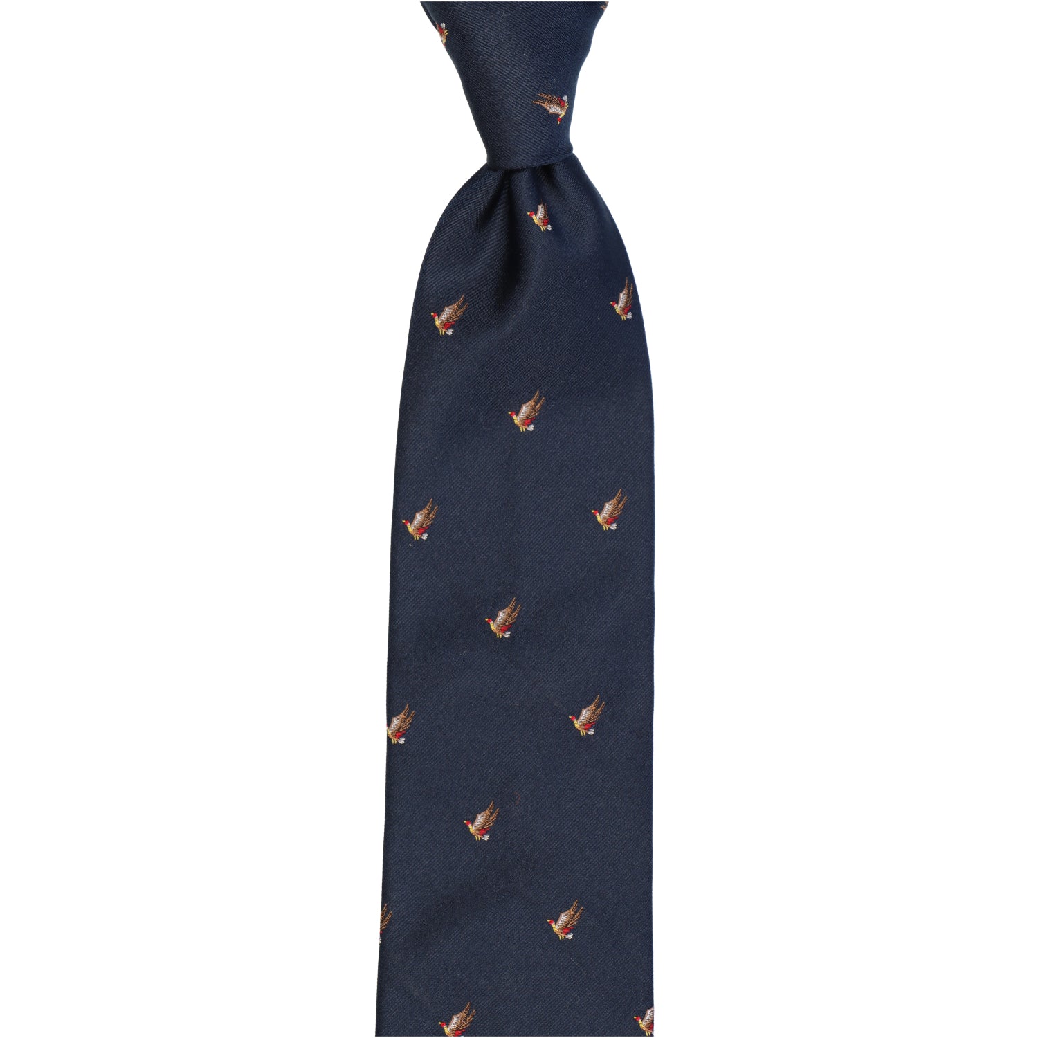 Diese Krawatte bringt Bewegung ins Spiel: Auf tiefem Nachtblau entfalten filigrane, fliegende Fasane ihre ganze Eleganz. Das Motiv erinnert an herbstliche Landschaften, Jagdtraditionen und stilvolle Landpartien – umgesetzt in einem zeitgemäßen, urbanen Kontext.