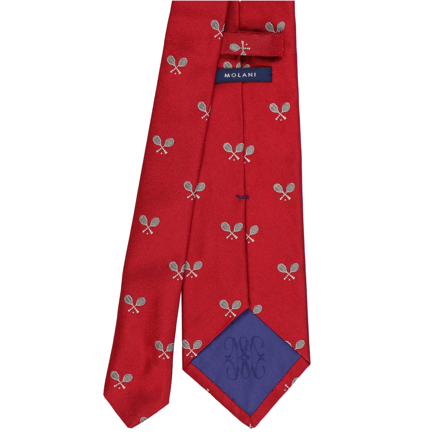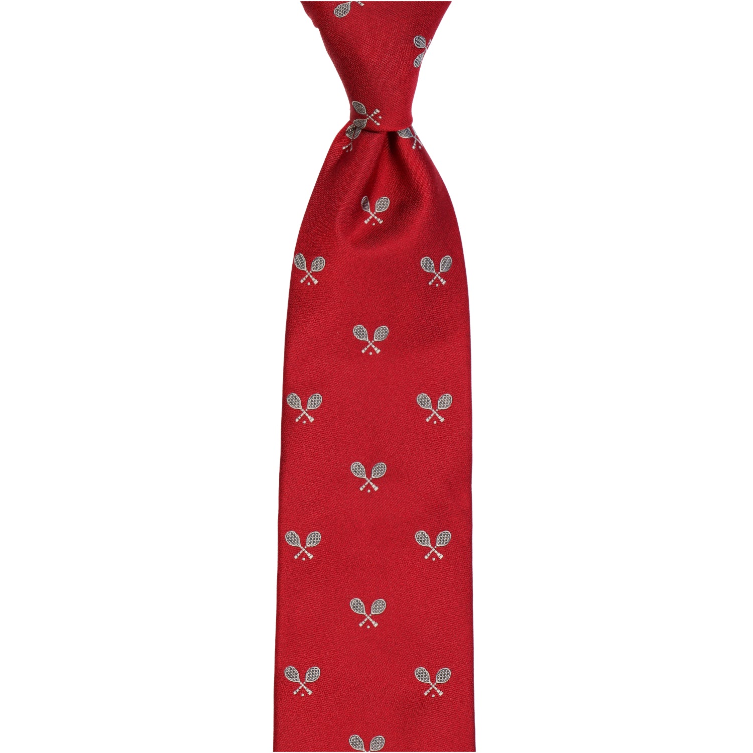 Ein stilvolles Ass für Ihre Garderobe: Die Krawatte Match Point besticht durch ihr sportlich-elegantes Motiv aus filigran gewebten Tennisschlägern auf kräftigem Rubinrot. Das Design verbindet klassische Mustertradition mit einem augenzwinkernden Verweis auf die Leidenschaft für das Spiel.