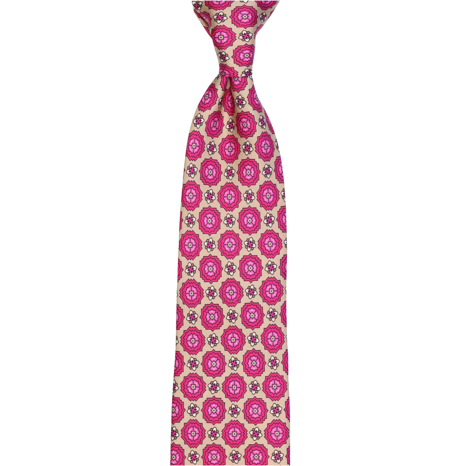 Ein prachtvolles Blumenornament in leuchtendem Pink auf warmem Sandton – diese Krawatte bringt die verspielte Eleganz italienischer Ornamentik mit zeitgenössischem Selbstbewusstsein zusammen.